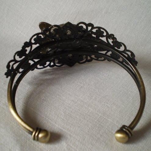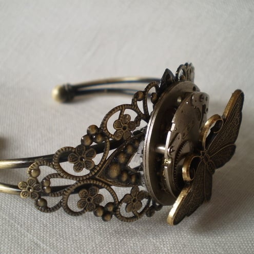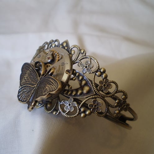 A gorgeous Steampunk bracelet has been created from an antiqued filigree base..... a lovely Vintage watch movement has been added... and to give a three dimensional quality to the piece an ornately etched butterfly has been given a home.