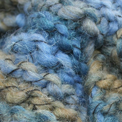 This shorter scarf, knitted in a wool blend yarn, wraps round and 'fastens' through a 'keyhole'. A smart addition to the neck line of a fitted jacket perhaps!