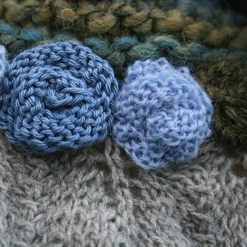 Both ends of the scarf are finished with a ruffle of knitted lace, worked in a 4 ply yarn. The top of each ruffle is embellished with three knitted roses and two knitted leaves. The scarf is worn by threading the opposite end through the keyhole slots.