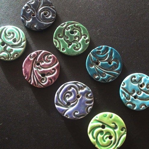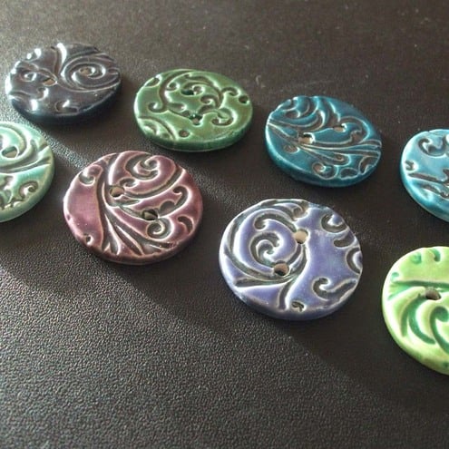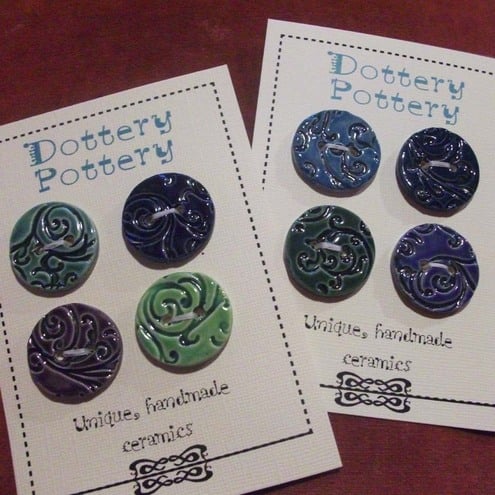 This set of eight buttons are made from white earthenware clay, embossed and glazed to 1100 degrees, so nice and strong.