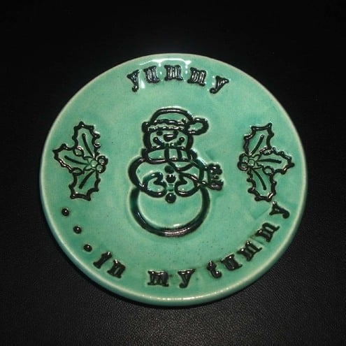 This plate is blue with a snowman and holly on and has the words " yummy in my tummy" imprinted around the edge.