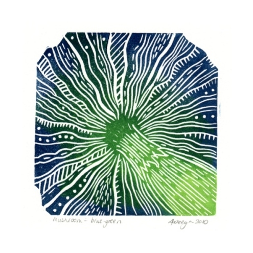 This is an original lino cut print (open edition). Printed from a hand-cut lino "plate" in green and blue inks on to Zerkall paper. This is a small print, the inked area measures approximately 9.5x9.5cm. It is supplied in a hand-cut, off-white mount. The mount measures 23x23cm.