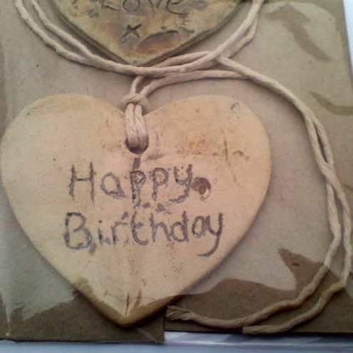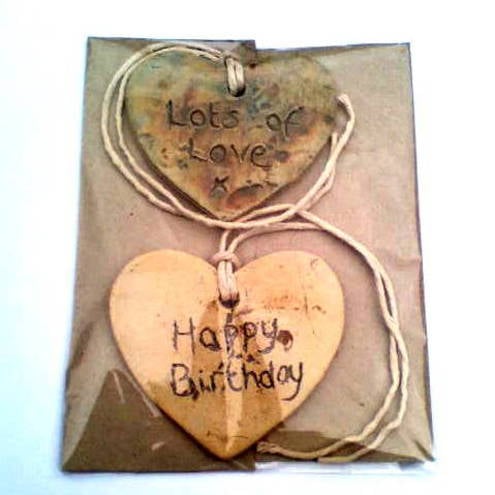 This particular set of 2 comes with a natural coloured heart shaped tag with the words 'Happy Birthday' engraved, and a natural coloured heart shaped tag with the words 'Lots of Love' engraved.