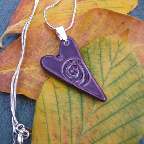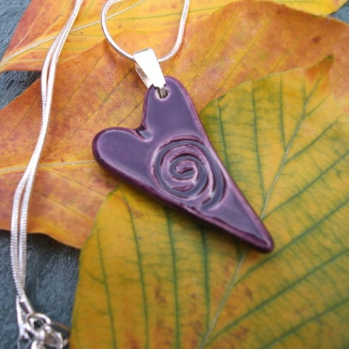 Was £15.00 now £13.00. Quirky ceramic purple heart with an impressed swirl, comes on a 40.5cm sterling silver snake chain and sterling silver bail. it measures approx