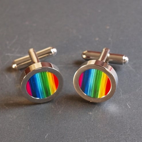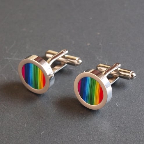 These colourful rainbow striped cuff links will brighten up any day. With all the colours of the rainbow in an unusual striped design they will match any outfit.