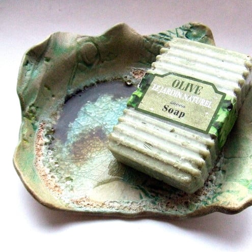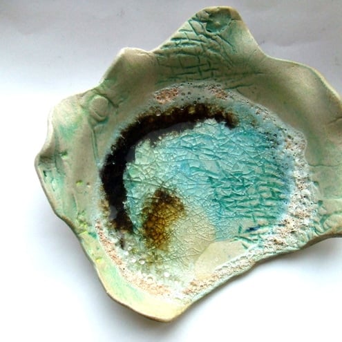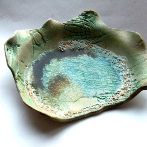 It has been impressed with a hessian texture, and highlighted with shades of green. The dish has melted recycled glass in the bottom which has created a crackled effect, and is smooth to the touch. Volvanic crater glaze has also been applied in areas.