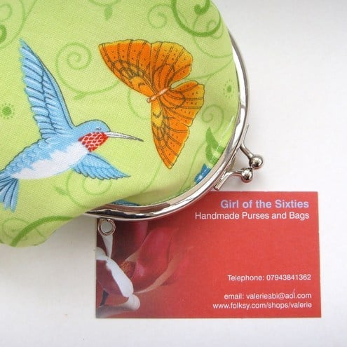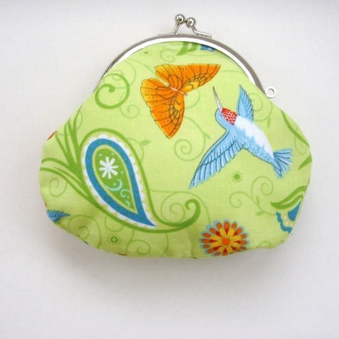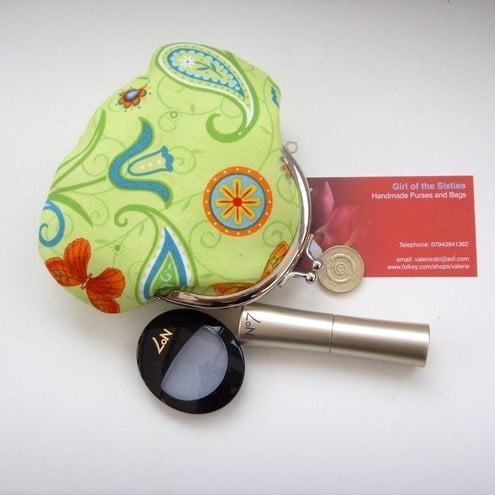 Green fabric with contrasting lining, padding and metal frame clasp.
