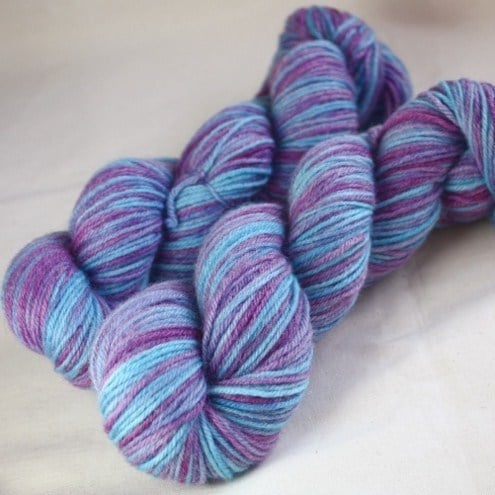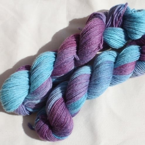 Light sky blue with lavender and pink. The yarn is reskeined as shown in the first two photographs but is shown before reskeining in the third photograph for reference only (third photograph has ben taken in bright sunlight). There is one skein left.