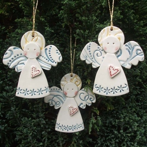 These cute little angels are made from white earthenware clay and decorated with coloured slips and glazes.