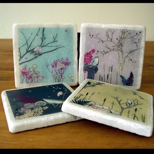 A set of four white marble coasters each decorated with an original littlebirdy design.