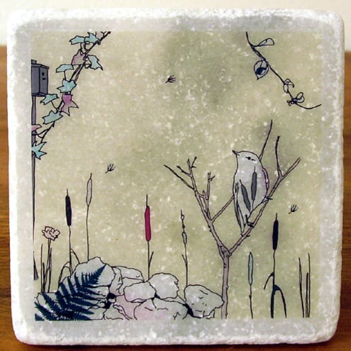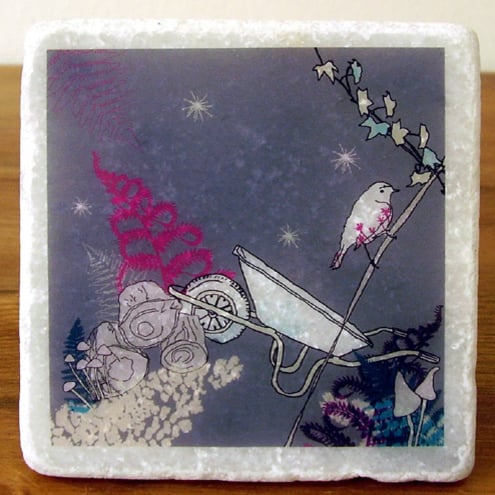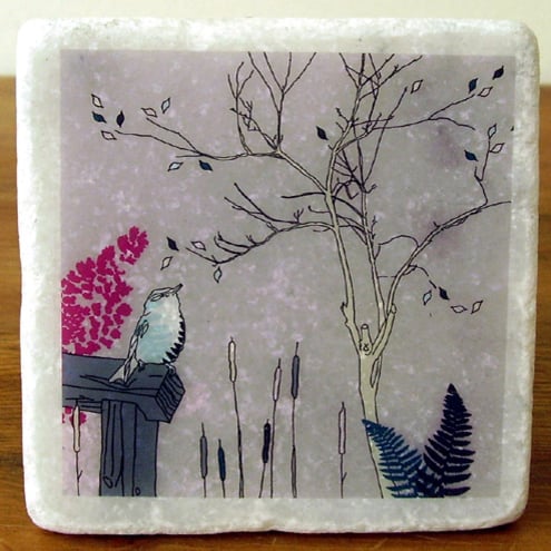 The designs are printed onto a special decal paper which i have carefully applied onto a white marble tile. The tile is then sprayed with acrylic sealent to make it waterproof and then coated with a couple of layers of matt acrylic varnish for further protection. They can be safely wiped clean without harming the design. Each tile also has foam feet making them scratch resistant and a 'littlebirdy' sticker on the back.