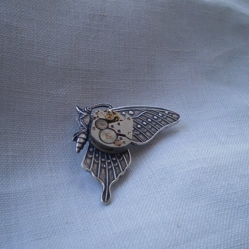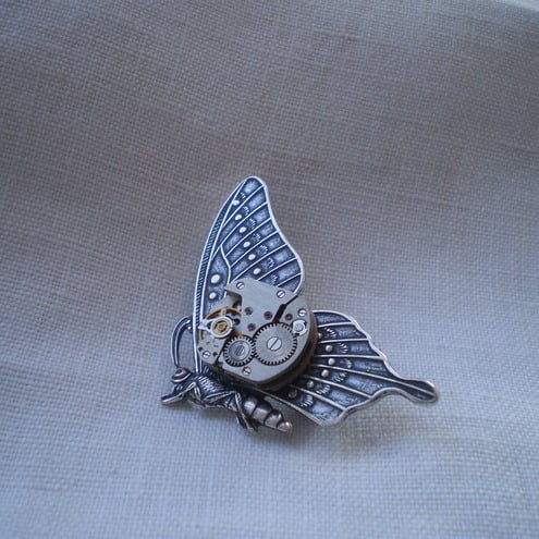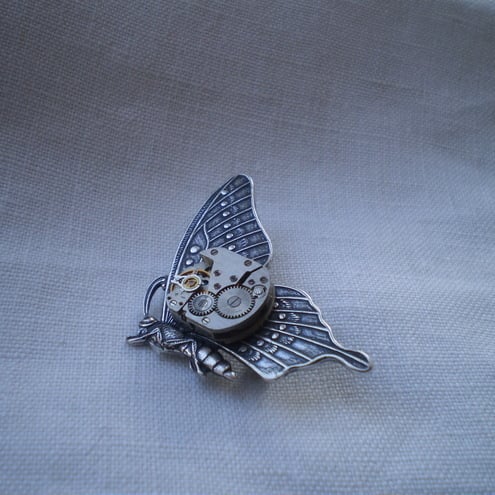 A Clockwork Butterfly in flight. A lovely intricate antiqued silver tone butterfly base has been enhanced with a Vintage watch movement to create this stylish brooch... the elegant in harmony with the unusual. Measures a demure 3.5 cms. Perfect for yourself to wear with that "Little Black Dress" or to give as a Christmas gift.