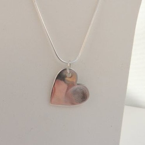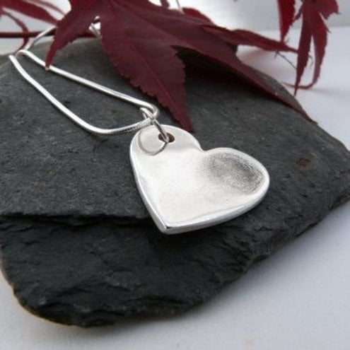 Handcrafted in fine silver, this pendant has a fine silver charm imprinted with your chosen fingerprint, and attached to a 16 inch sterling silver snake chain.
