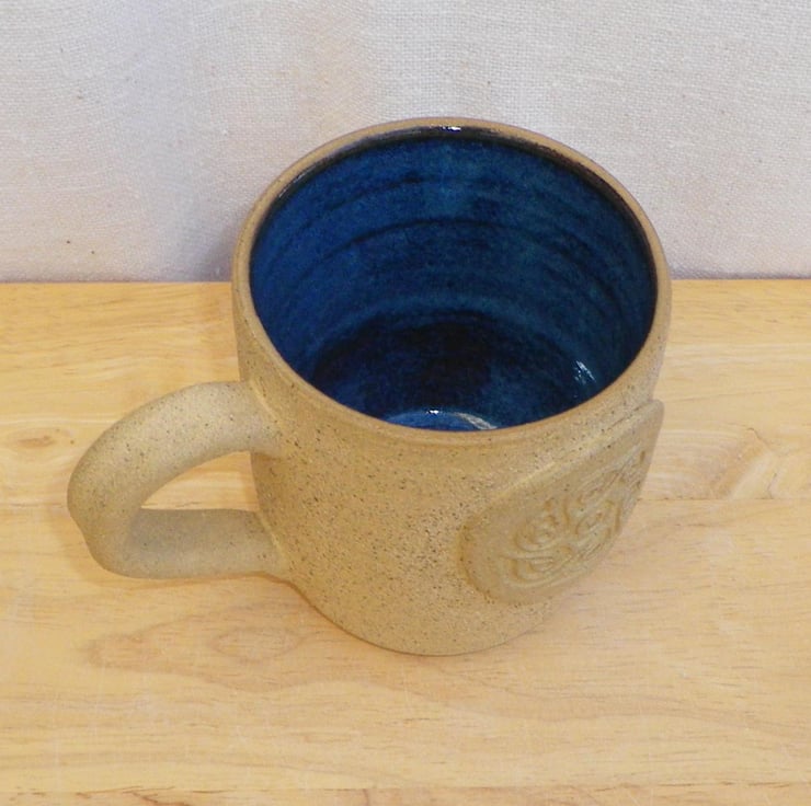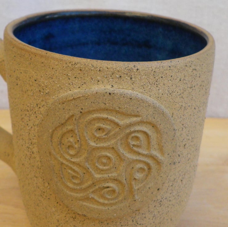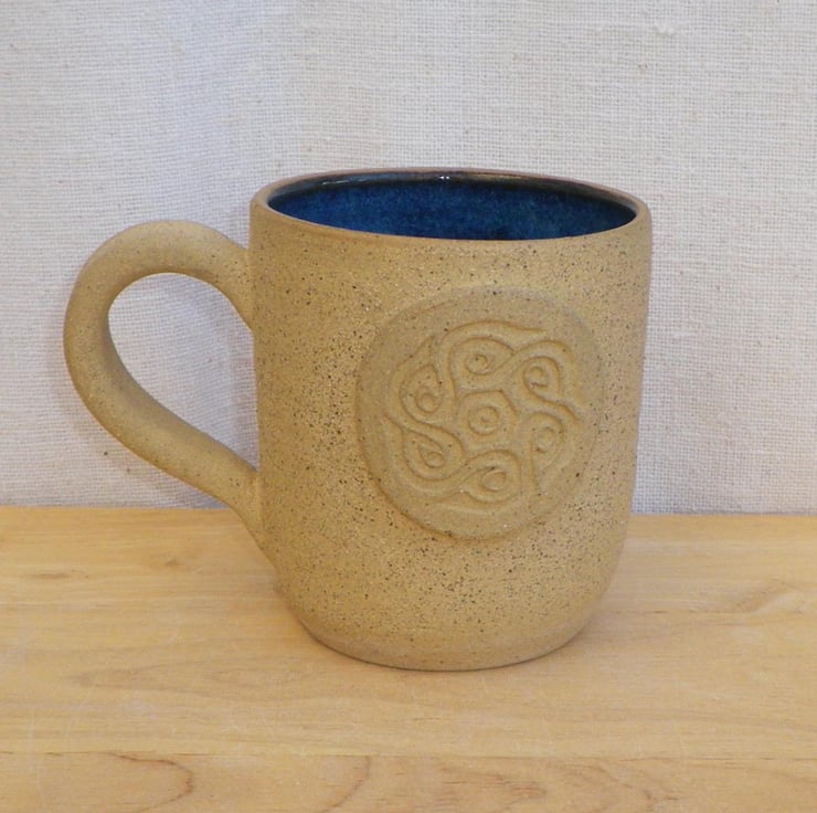 I threw this mug on my pottery wheel using strong stoneware clay and added a celtic knotwork motif to the side.