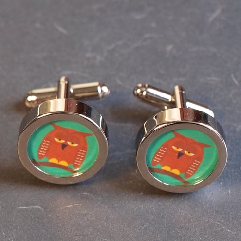 Owl cartoon cuff links with original artwork. Very cute and lots of fun, these cartoon woodland owl cuff links will brighten up the day. From a new range of cartoon animal cuff links I'm currently designing, watch out for new additions.