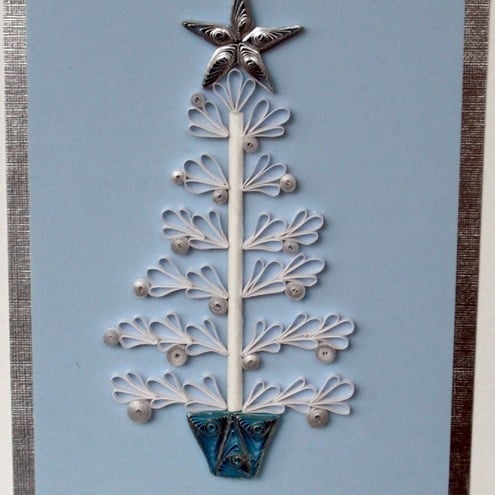 A delicate quilled Christmas tree, in shades of white, pale blue and silver mounted on a silver panel.