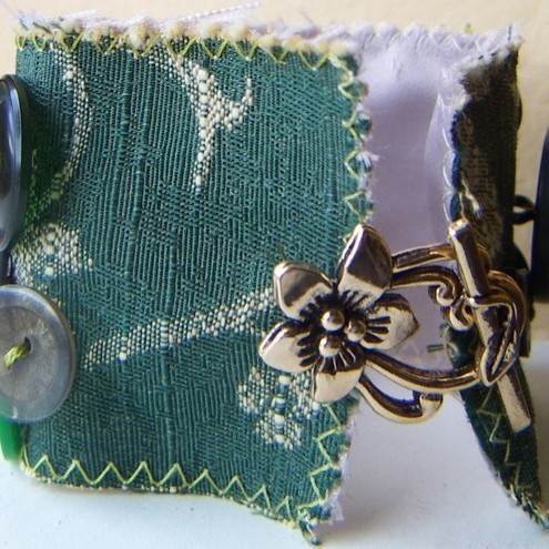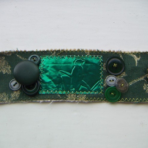 Wristlet made from green and gold cotton brocade, with embossed and stitched green aluminium bird embellishment, vintage buttons and brass tone fastening. Raw stitched edge and lined with oyster satin.