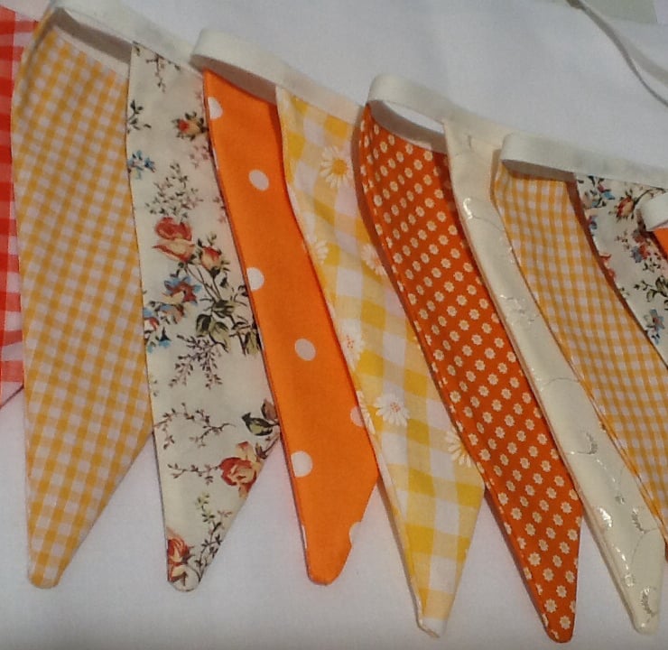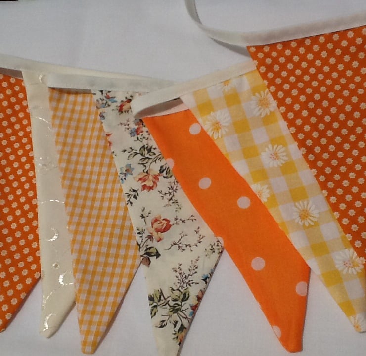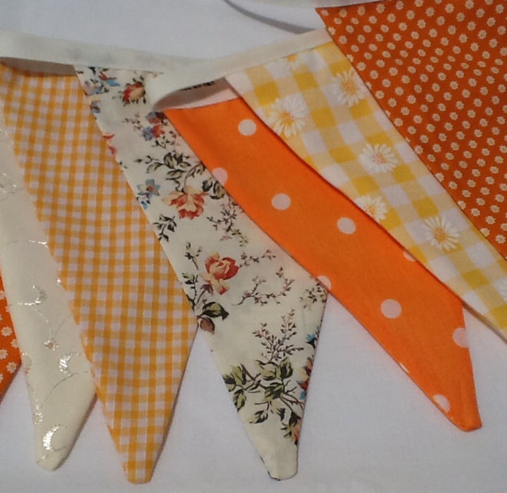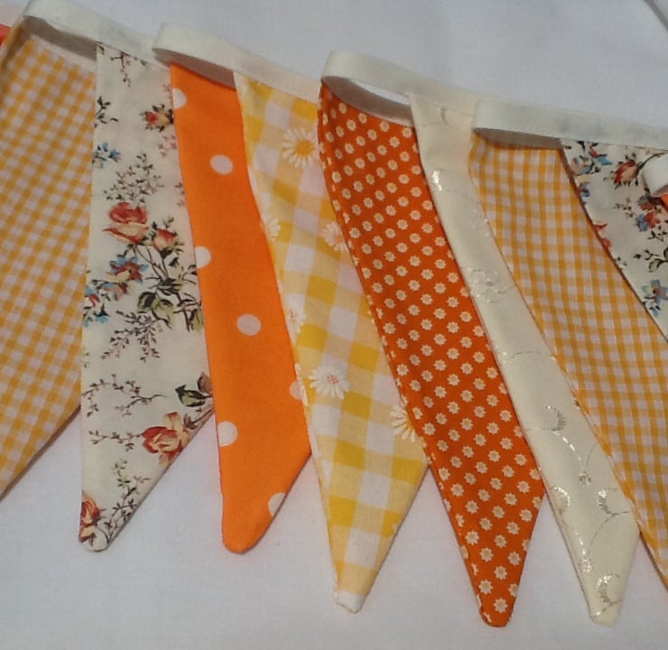 Great for indoors or out, garden party, wedding, afternoon tea or to brighten up any room. The fabrics are a yellow, orange and, white mix of vintage and new with designs from the likes of Laura Ashley and Liberty's in London.