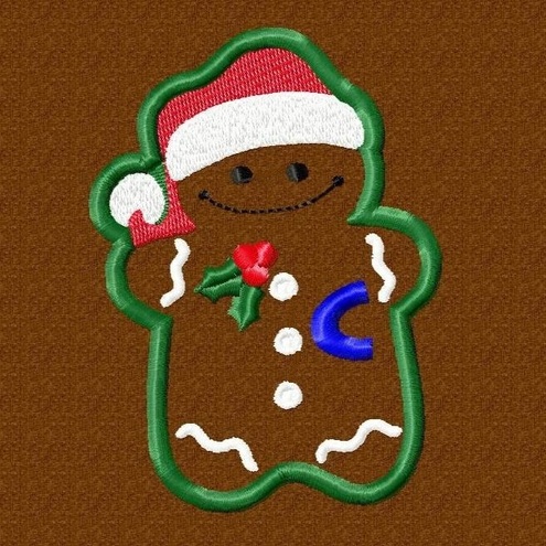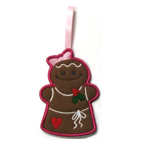 Each happy little gingerbread person is machine embroidered onto brown felt and backed with plain felt. There's a ribbon loop so you can hang him or her on your Christmas tree.