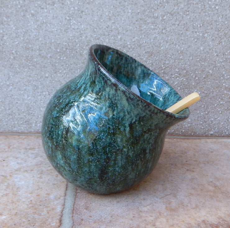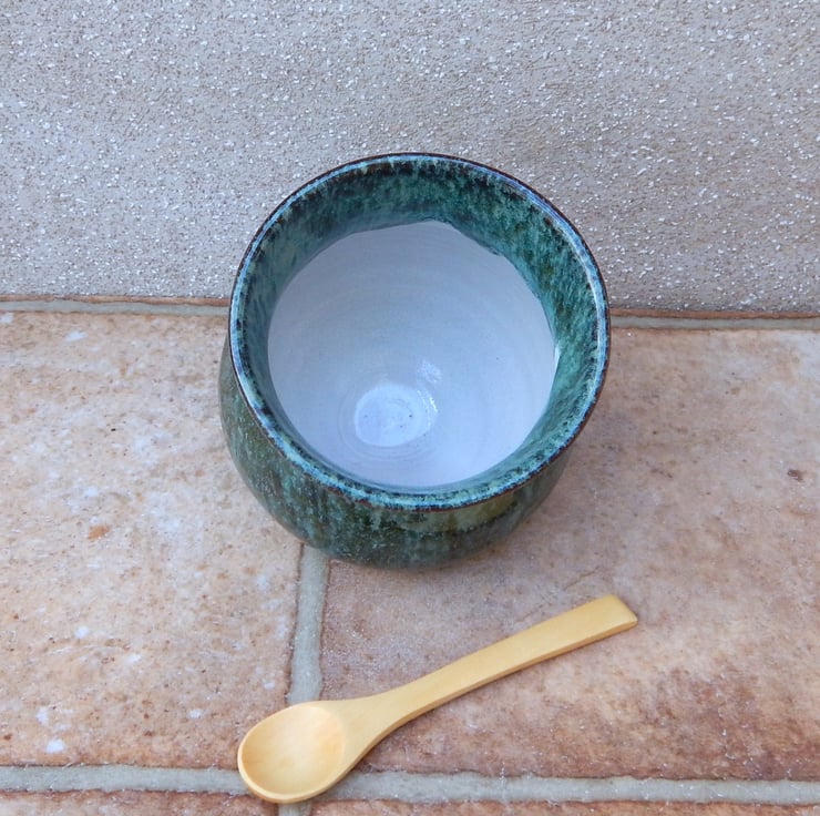 I threw this salt cellar on my pottery wheel using strong red earthenware/terracotta clay and finished it in a lovely runny dark green reactive glaze.