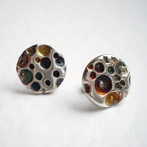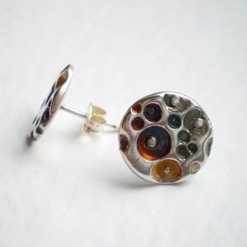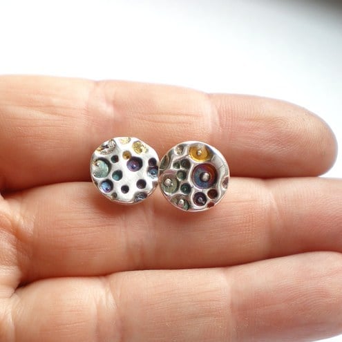 Little silver coral textured round post style earrings with a colourful patina. Inspired by nature, made from recycled silver making them a great eco friendly choice!