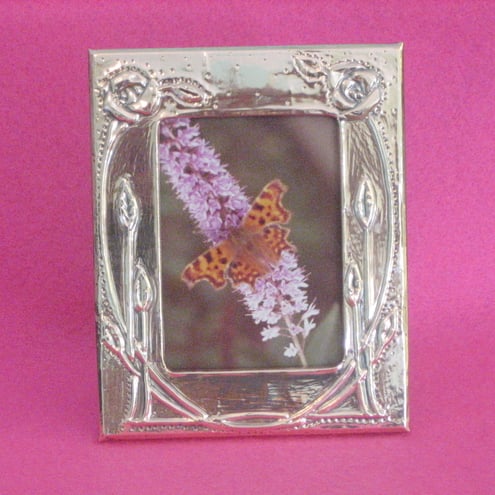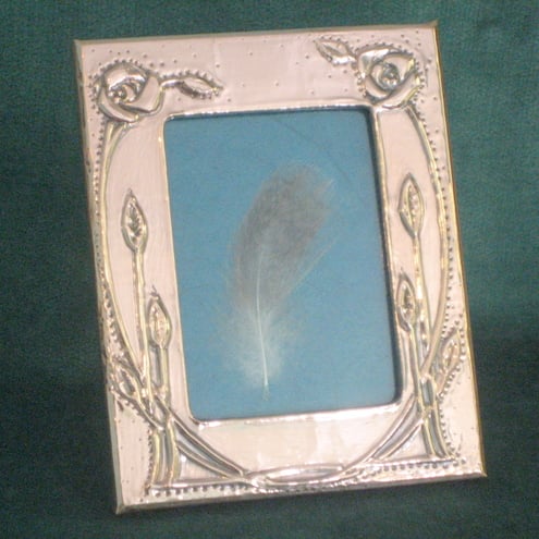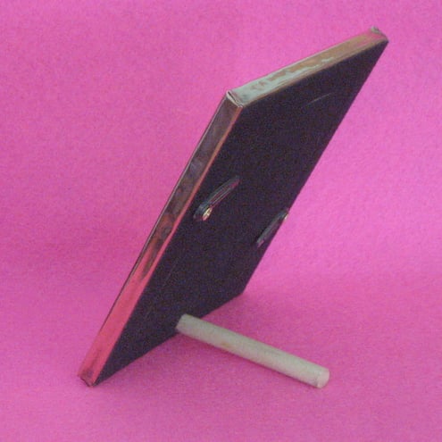 This little frame has been hand-crafted in copper in the style of Charles Rennie Mackintosh.It measures 103 x 82mm overall and the aperture is 65 x 41mm. The stand consists of a wooden peg that slots into a hole on the reverse,which is covered in black velour.