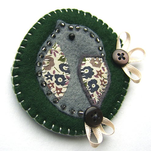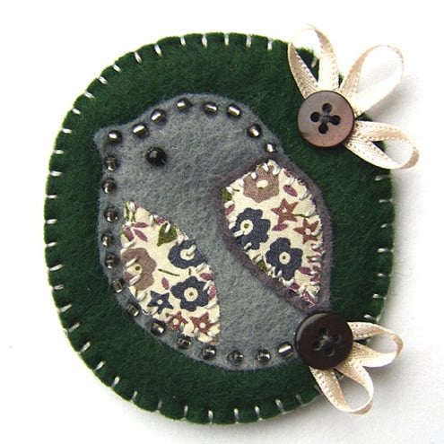This is a lovely handmade fabric brooch. It features a little bird with appliqued wing and belly in lovely Liberty print fabric. The bird is edged with pretty coordinating beads and has a ribbon tail. It is mounted onto an oval green felt base and is finished with a button and ribbon detail. Brooch backing for easy attachment.