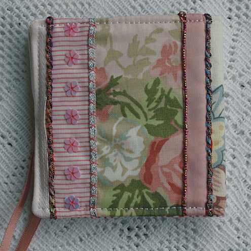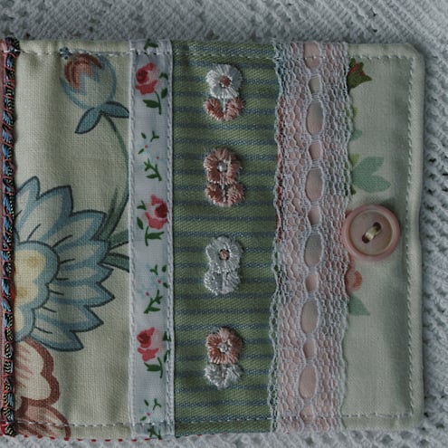 Coordinating pink and green toned fabrics have been chosen to produce the patchwork which forms the main fabric for this needlecase. Embellishments of lace, ribbons, trimmings and sequins have been added to complete the design.