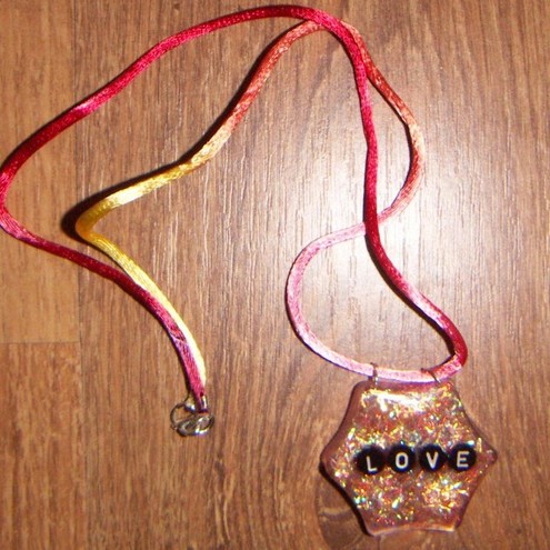 Pink resin pendant containing multi-coloured sparkly strands and beads spelling 'Love'. Hung on co-ordinating satin cord. Silver plated fastenings. Pendant is approximately 1 1/2 inches tall.