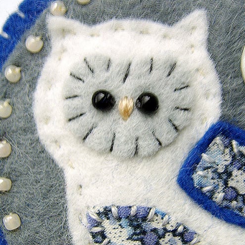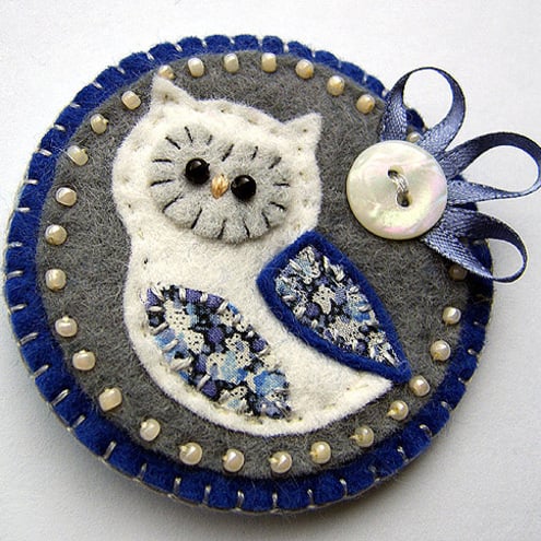 It features a little owl with appliqued wing and belly in pretty Liberty print fabric. It is mounted onto a circular felt base which is edged with pretty beads. It is finished with a button and ribbon detail and has a brooch backing for easy attachment.