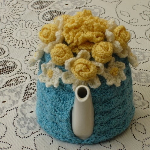 The cosy has been handmade using good quality wool-mix yarn in a lovely blue colour. The top of the cosy is decorated with a large yellow carnation, four small yellow roses, four cream flowers with petals and rose centres and six pretty little cream flowers with yellow crocheted bobble centres.