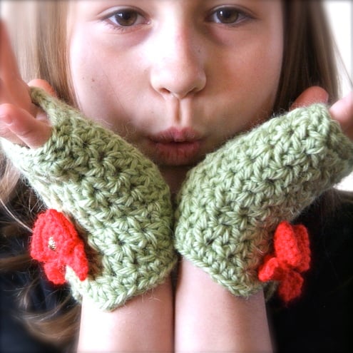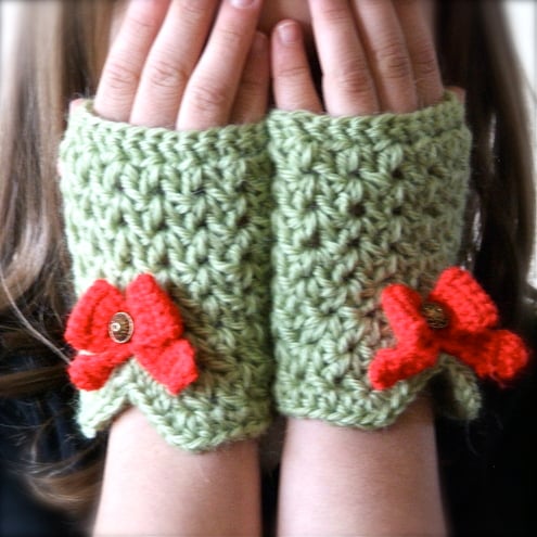 funky fingerless crochet mittens to keep your hand warm during Autumn, adorned with red crochet bow and vintage button