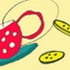 A sweet little toadstool in red and white felt is appliqued onto ditsy floral fabric. It is mounted onto a lightly padded green felt base and has a brooch backing for easy attachment.