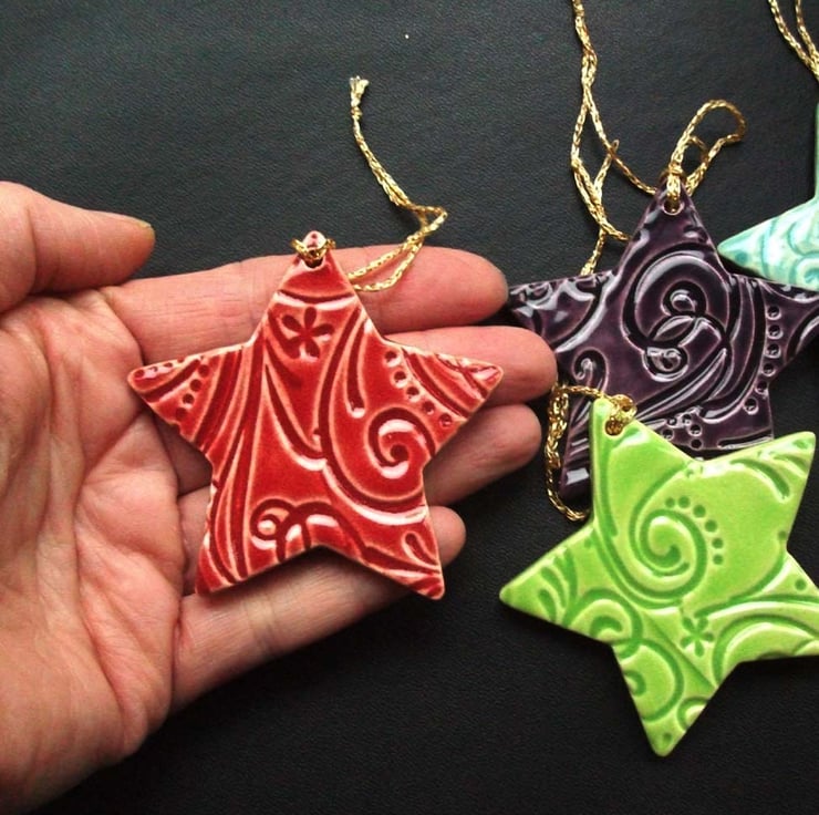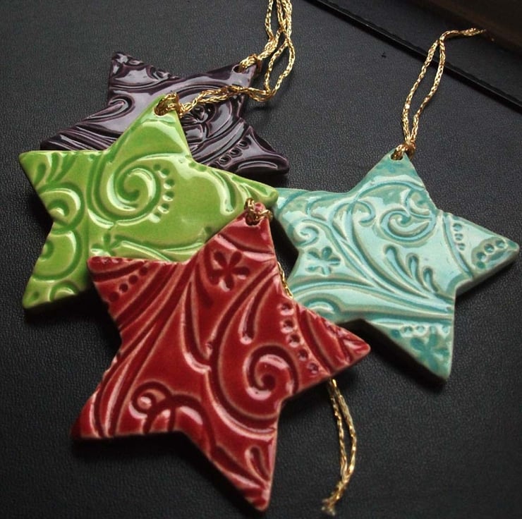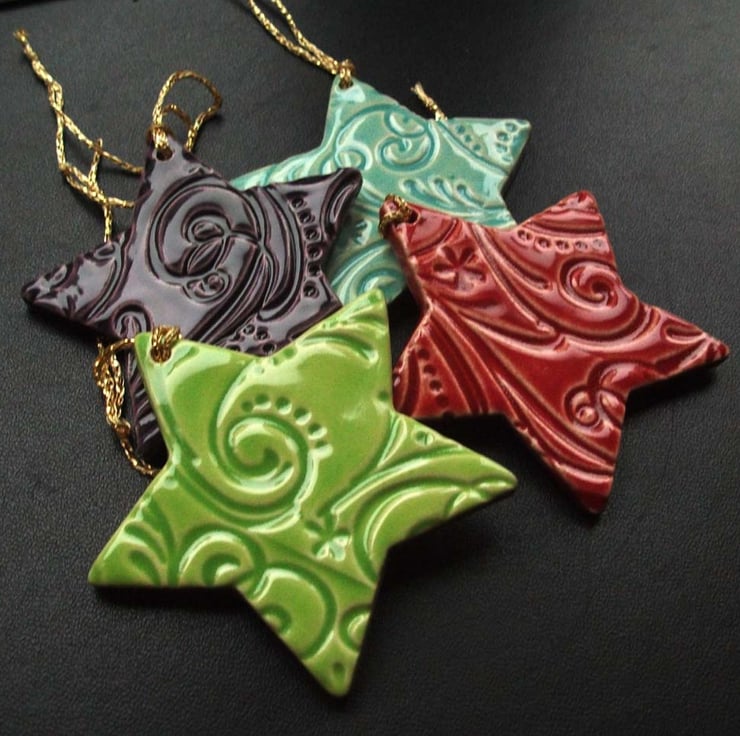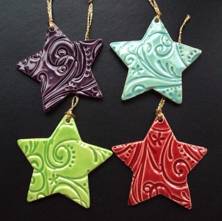 This is a set of 4 ceramic stars are made from white earthenware clay and glazed in a variety of gorgeous bright colours.