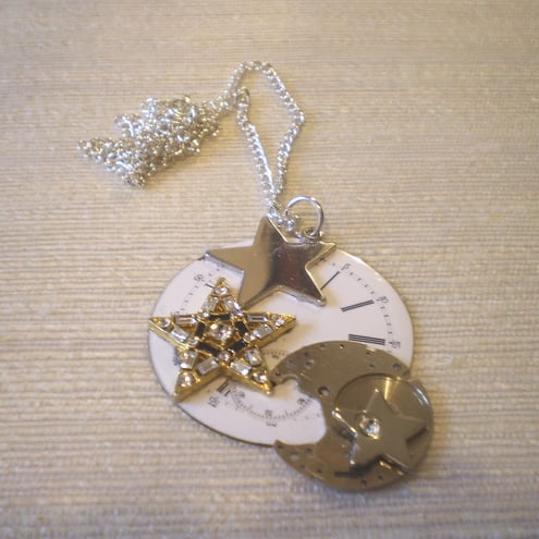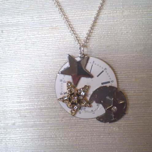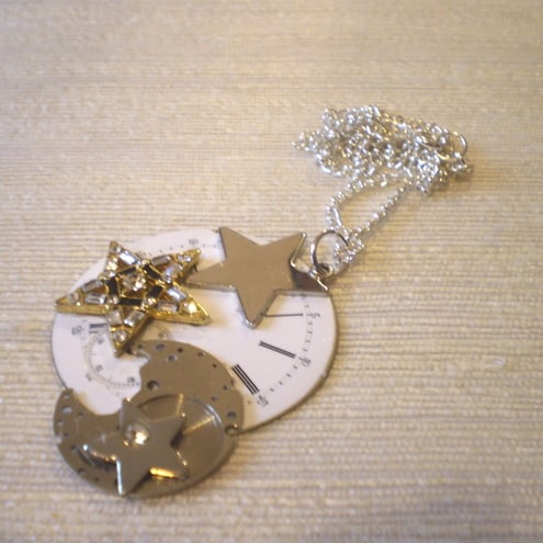 A white vintage porcelain pocket watch dial and moon shaped watch part, have been adorned with stars, resembling the night sky. Two gleaming silver stars, the smaller one has a clear crystal accent, enhance the black and white glittering baguette stone star.