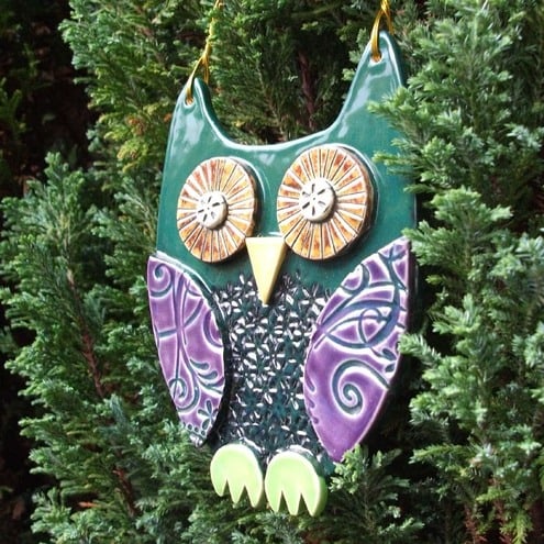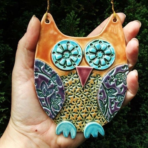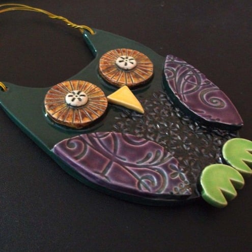 This cute ceramic owl is made from white earthenware clay with all the individual pieces hand cut and decorated.