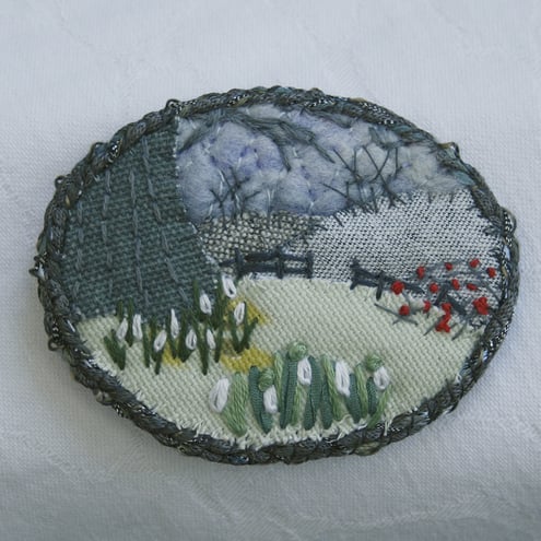 This scene has been hand appliqueed, from scraps of grey and pale green fabric. Distant trees, fence, and hedge are stitched in a mixture of threads. The snowdrop leaves in the foreground, are embroidered in silk ribbon, the snowdrop flowers in embroidery thread.