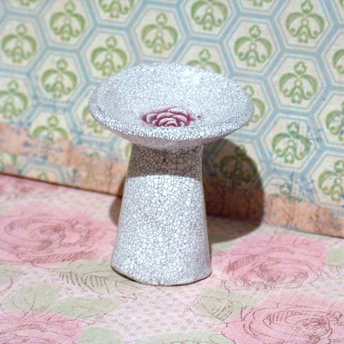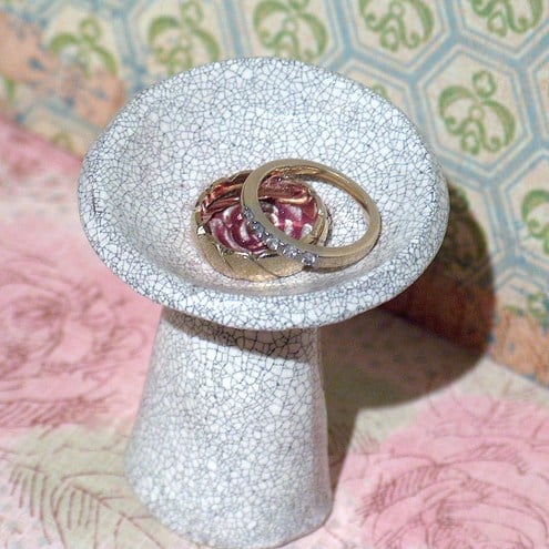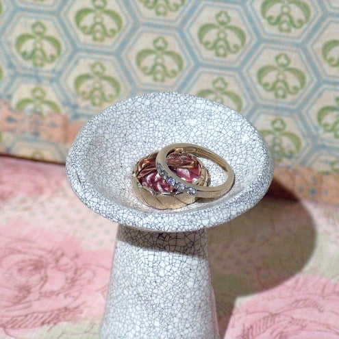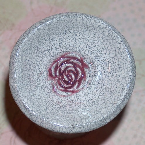 A handmade ceramic trinket holder, a small cup on the top will hold your rings or trinkets and is decorated with an embossed rose. The finish is a crackle glaze. Would make a lovely gift for christmas.